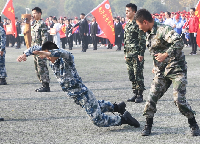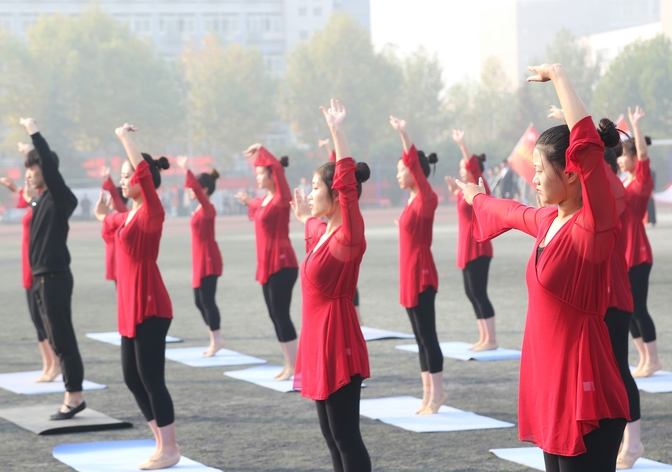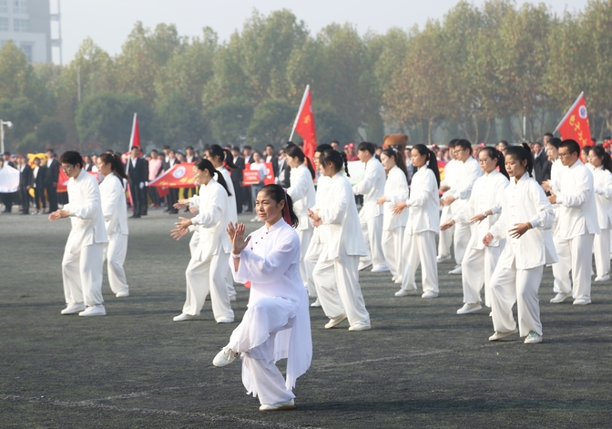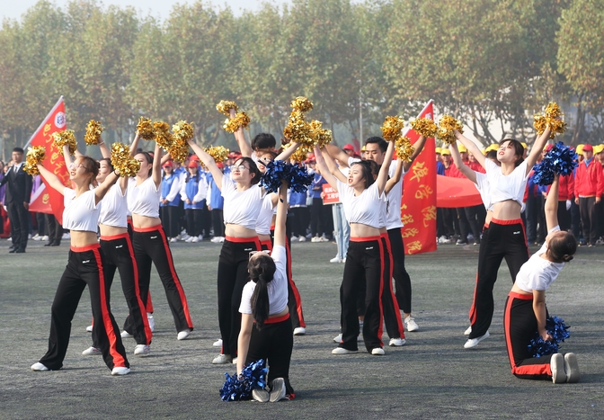 在一阵阵欢呼声中,开幕式节目一一精彩上演。瑜伽演员身着一袭红衣,在悠扬的音乐中翩翩起舞,尽显柔韧身姿。五禽戏变幻莫测,表演者在“虎”“猿”“鹿”“熊”“鸟”的身形中来回切换,引得台上掌声雷动。活力四射的啦啦操演绎着不断奋发向上的激情与自信,每一个动感的舞步都踩出不一样的青春与活力。热血沸腾的擒拿格斗,踢、打、摔、拿结合进、退、闪、躲,流畅、迅猛的招式引得喝彩声不断。最后登场的太极扇表演,连贯的动作如行云流水,端庄不失流利,刚健蕴含柔美。