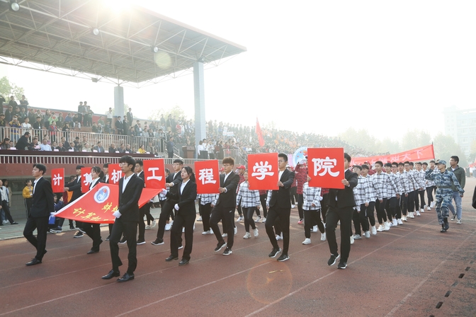 运动场上,彩旗林立;看台上,人头攒动,一片热闹欢乐的景象。伴随着嘹亮的开场曲,各学院方阵代表队陆续走过主席台,接受检阅。计算机工程学院代表队高举“E线连南北,E键知天下”的红色横幅,寓意计算机工程学院不断开拓、勇于创新,在教学科研等方面再获佳绩。“祝祖国母亲生日快乐!”在一片高呼声中,理学院代表队高举国旗,步伐坚定,以一颗勇争第一的决心来表达对祖国的热爱与祝福。材料与化学工程学院的同学们用黄色KT板拼出“C H”字样,表达材化学子对材化院自建立以来不断发展壮大的喜悦和自豪。外国语学院代表队手持“中国梦”主题标语,英姿飒爽,展现他们志存高远、勇担时代重任的精神风貌。“志比天高,气宇轩昂,经管学子,力争更强”经济与管理学院代表队的口号响彻操场,尽显青春风采……各个学院各具特色,创意十足,为全校师生送上一场视觉、听觉上的饕餮盛宴。