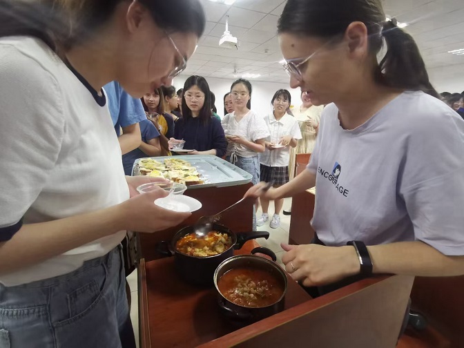 6月23日上午的第四节课对于外国语学院18级翻译的同学们来说终身难忘。一走进F506教师,同学们就被整齐摆放的匈牙利烤饼、蛋卷、三明治和满满三大锅的匈牙利肉汤所吸引。在同学们一片惊喜中,来自匈牙利的Yang-lovas Krisztina老师给大家体验了一节与众不同的匈牙利文化课。她用丰富生动的视频和图片带领同学们体验了匈牙利悠久的历史、丰富的文化和别样的风俗,并带着同学们学唱匈牙利民谣。