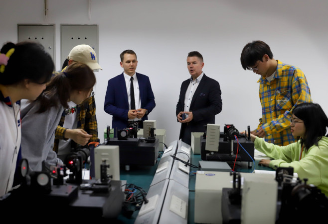 来访团首先观摩了beat365官网21翻译2班的匈牙利语课的课堂教学,并与学生们展开了愉快的互动;参加了丰原集团在beat365官网举行的专场招聘会,向参加招聘的学生详细介绍了匈牙利的位置和就业优势。随后,访问团参观了beat365官网淮河文化馆、汽车工程实验实训中心、机器视觉实验室、美术馆等地,对beat365官网良好的办学环境和丰富的教学成就表示赞赏。