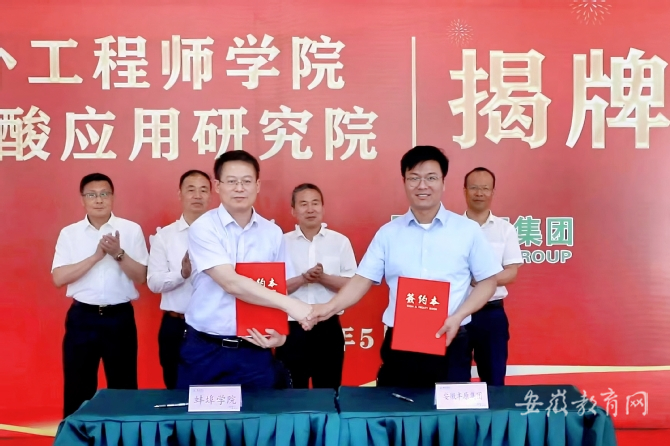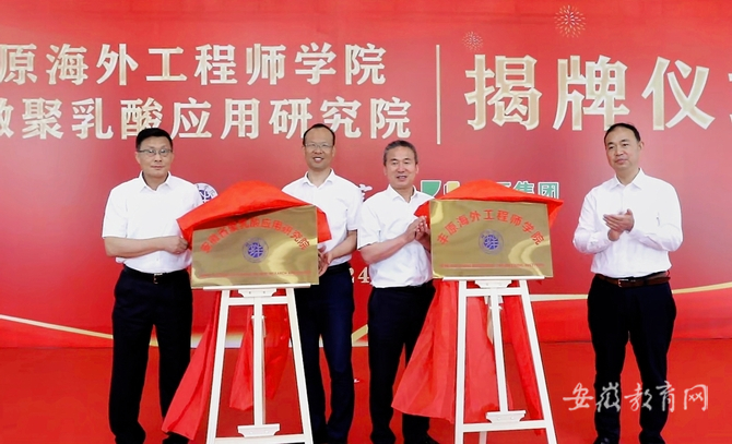 为服务安徽丰原集团在匈牙利投资的柠檬酸项目高质量发展,助力蚌埠市生物基新材料产业发展新高地建设,经前期沟通协商,5月29日上午,丰原海外工程师学院、安徽省聚乳酸应用研究院揭牌仪式在beat365平台官方网站举行。蚌埠市人民政府副市长、党组成员吴永彬,安徽省人民政府外事办公室出国处处长王浩,蚌埠市外事与商务局副局长宋跃辉,蚌埠市工业与信息化局党组成员姜宝国,安徽丰原集团有限公司副总经理陈礼萍,beat365平台官方网站党委副书记、院长孙艳辉,beat365平台官方网站党委副书记韦文联出席活动;beat365平台官方网站副院长郭有强主持揭牌仪式。