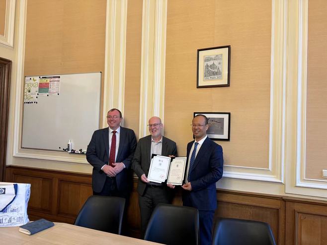 在比利时,出访团一行首先访问了列日大学让布卢农业生物技术学院,与院长弗里德里克·弗朗西斯等进行了会谈,并实地考察该院的食品研发中心。孙艳辉向该校食品专业负责人布莱克·克里斯托弗博士颁发了客座教授聘书。出访团与列日大学中国博士留学生举行了人才招聘座谈会,孙艳辉介绍了beat365平台官方网站的高层次人才引进政策。