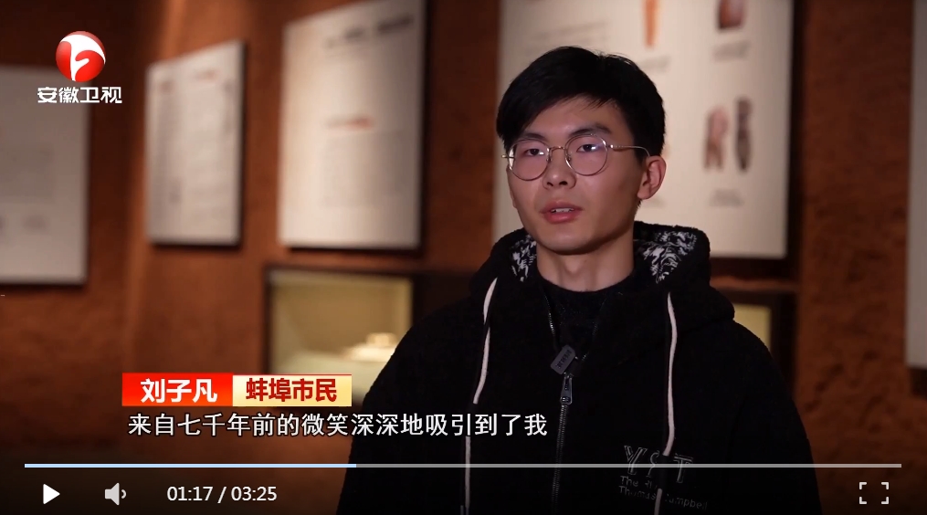 当他正在为游客介绍陶塑雕题纹面人头像额头的同心圆纹时,《安徽卫视》新闻联播栏目对其进行了采访。在被问及“在看到陶塑雕题纹面人头像后,对于蚌埠的一些历史文化,有什么感悟?”他表示,“作为土生土长的蚌埠人,来自7000年前的微笑深深吸引到了我,让我感受到了淮河流域独特的文化魅力。”