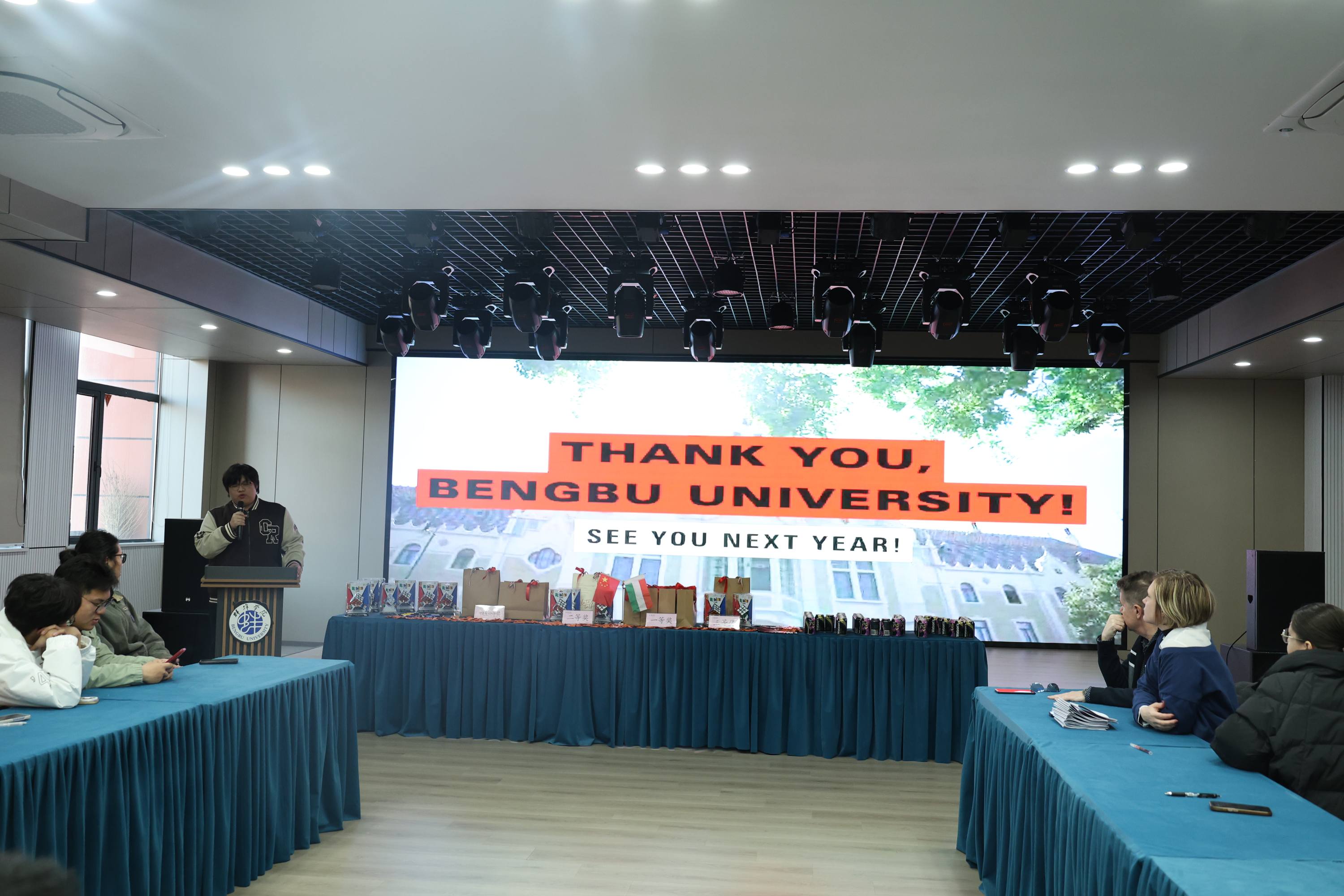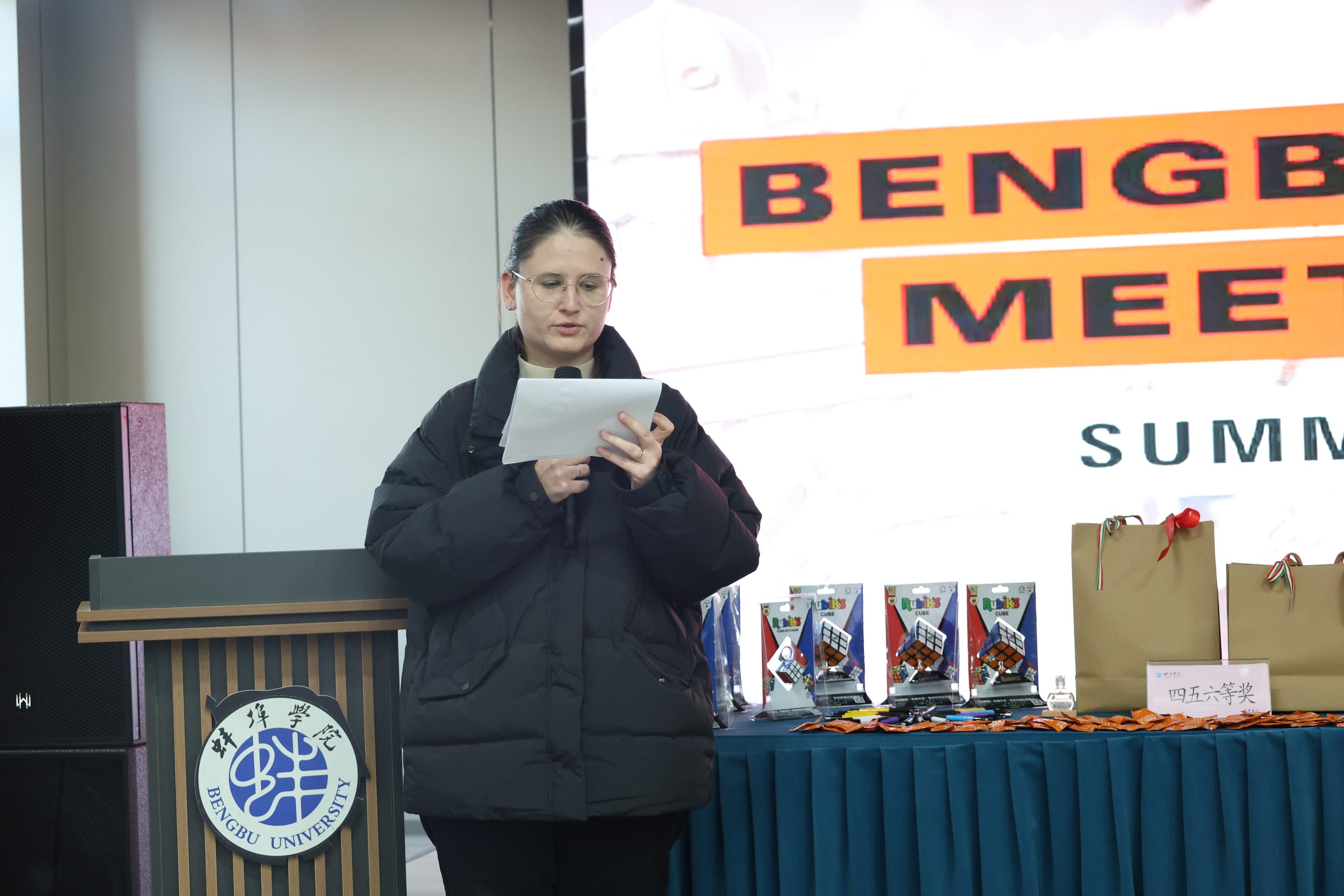 活动下半场由beat365官网匈语教师杨缇娜(Yang-Lovas Krisztina)主持。她详细地向学生们介绍了比赛规则:参赛者需在10分钟内,根据展示板的内容完成一份包含20道题的测试。同学们的参与热情高涨,最终25机制1班的方宁等同学脱颖而出,荣获一等奖。来自机械与车辆工程学院、经济与管理学院、计算机与信息工程学院、艺术设计学院等不同学院的同学们分别荣获了二、三、四、五、六等奖。卡帕缇•约瑟夫和爱丽丝老师为获奖同学颁发了魔方、圆珠笔等具有匈牙利特色的奖品。