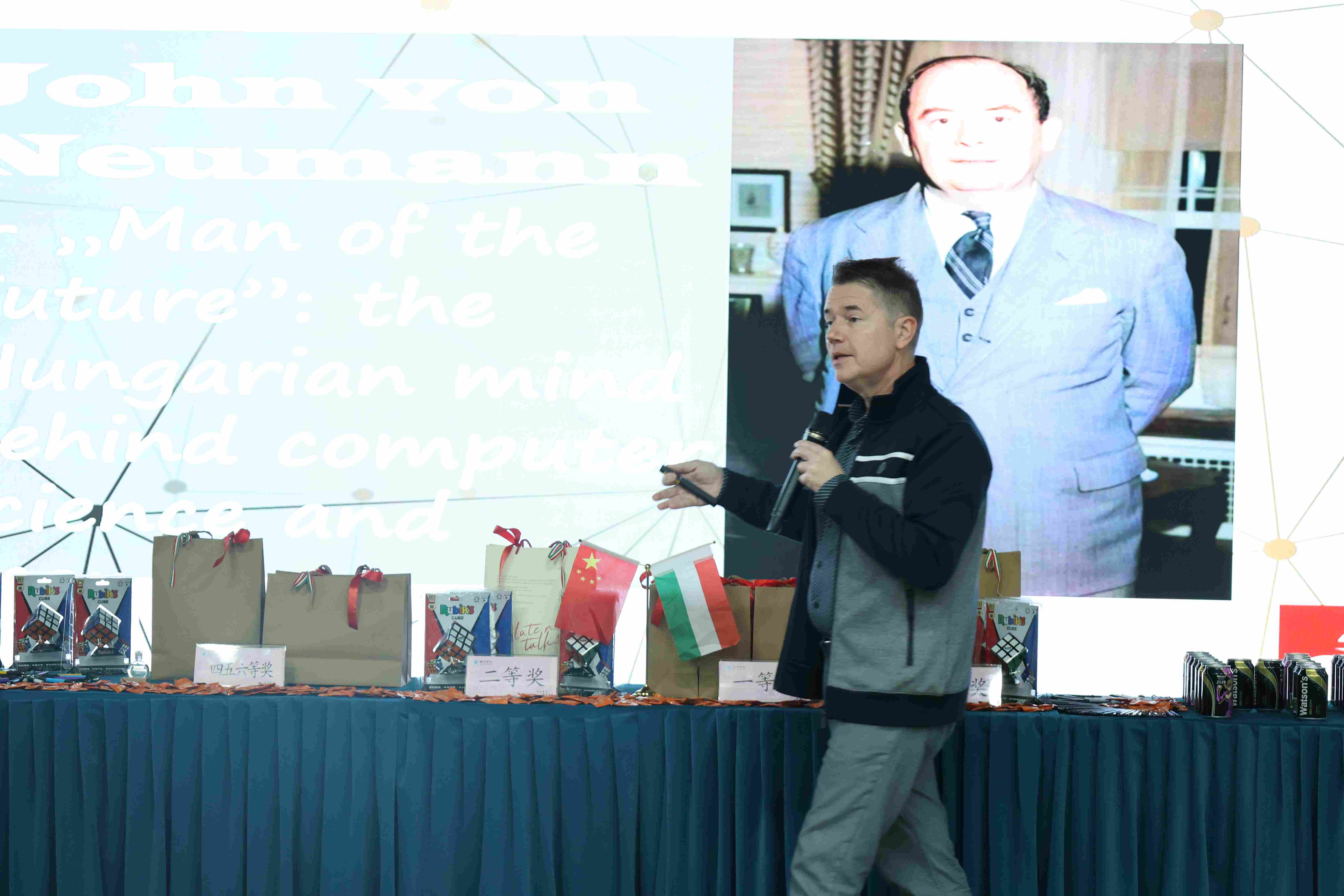 活动上半场,外事处负责人向与会者详细介绍了本次活动的主题与规则。随后,beat365官网匈牙利籍教师爱丽丝(Kis Aranka)生动讲解了阿尔伯特的维生素C、卡尔曼的滤波器、鲁比克的魔方等匈牙利科学发明对世界的影响。接着,来自约翰•冯•诺依曼大学经济与商学院的院长卡帕缇•约瑟夫(Dr. Kárpáti József)深入介绍了被誉为“计算机之父”的约翰•冯•诺依曼在数学及计算机信息技术领域的杰出贡献。beat365官网24自动化专业的芦敏泽即兴分享了他今年参加匈牙利暑期研学的体会。在场学生听得全神贯注,掌声此起彼伏。