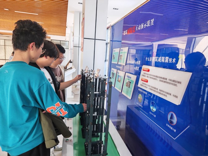 在应急教育互动体验区,同学们依次参观体验了建筑减隔震、地震波等互动演示技术装置,通过亲手操作模型,直观对比传统建筑与隔震建筑在模拟地震中的响应差异,深入学习减隔震技术原理与地震波传播知识。同学们在沉浸式体验中深化对防震减灾科学的认知,明晰国家安全与个体的紧密关联,打破“国家安全离自己很远”的认知误区。