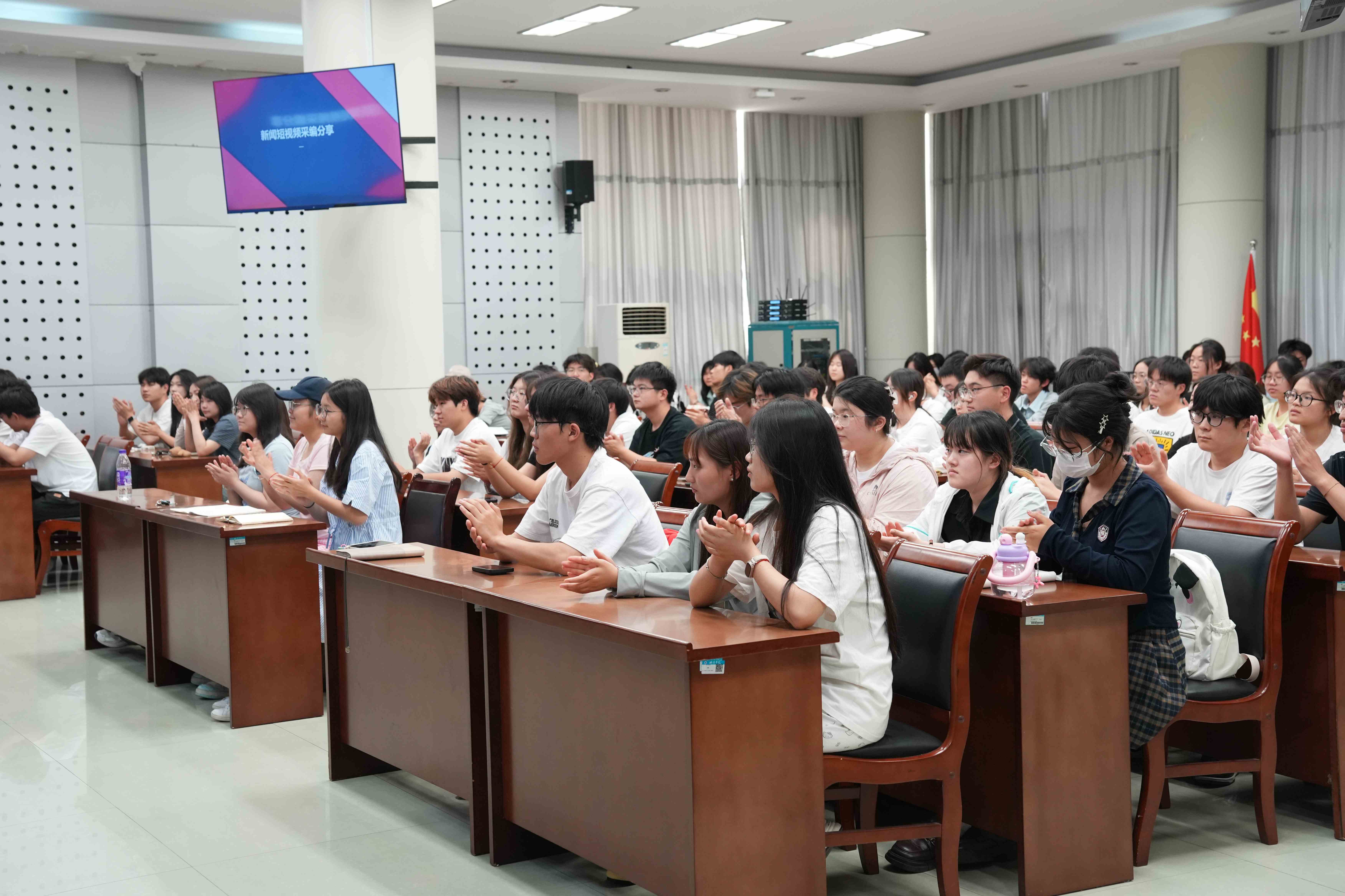 讲座中,李博结合蚌埠日报新媒体运营、短视频采编的实战经验,带来了短视频创作的“独家秘籍”,他介绍了短视频拍摄的四大基本要求及多种实用技巧,并结合案例为同学们介绍了视频采编“基础款”“进阶款”“爆款”等不同的特点及创作要领。