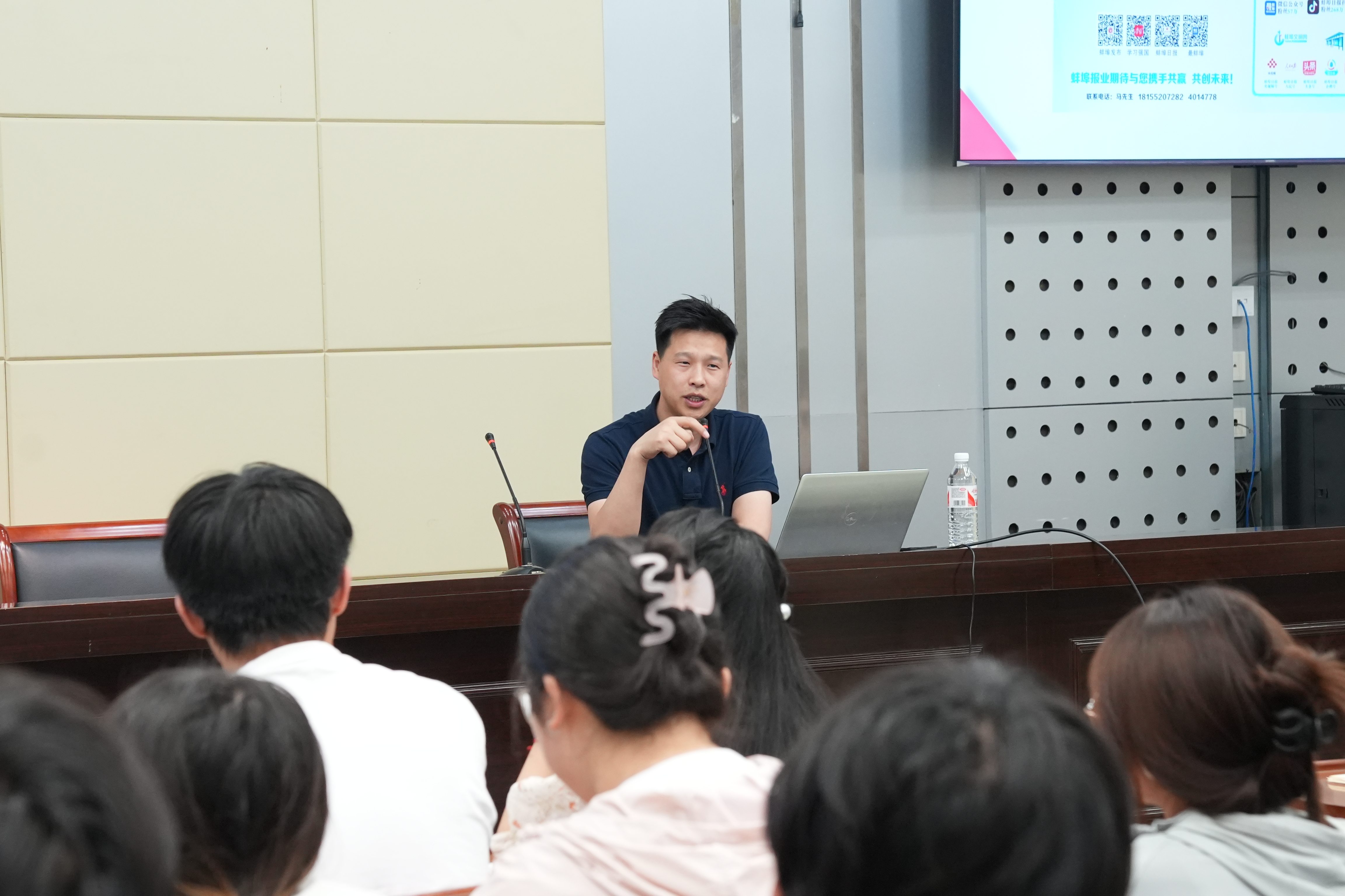 为持续推进深入贯彻中央八项规定精神学习教育走深走实,扎实开展“我为群众办实事”实践活动,学校紧扣师生新媒体宣传实际需求,聚焦帮助新媒体爱好者提升技能、增强本领,扩大学校正面宣传声势,讲好学校高质量发展故事,6月18日,beat365平台官方网站邀请蚌埠日报社新媒体开发部李博主任来校开展淮畔融媒大讲堂第九期——“短视频新闻采编讲座”。学校新媒体平台学生骨干、全校新媒体宣传爱好者120余人聆听讲座。