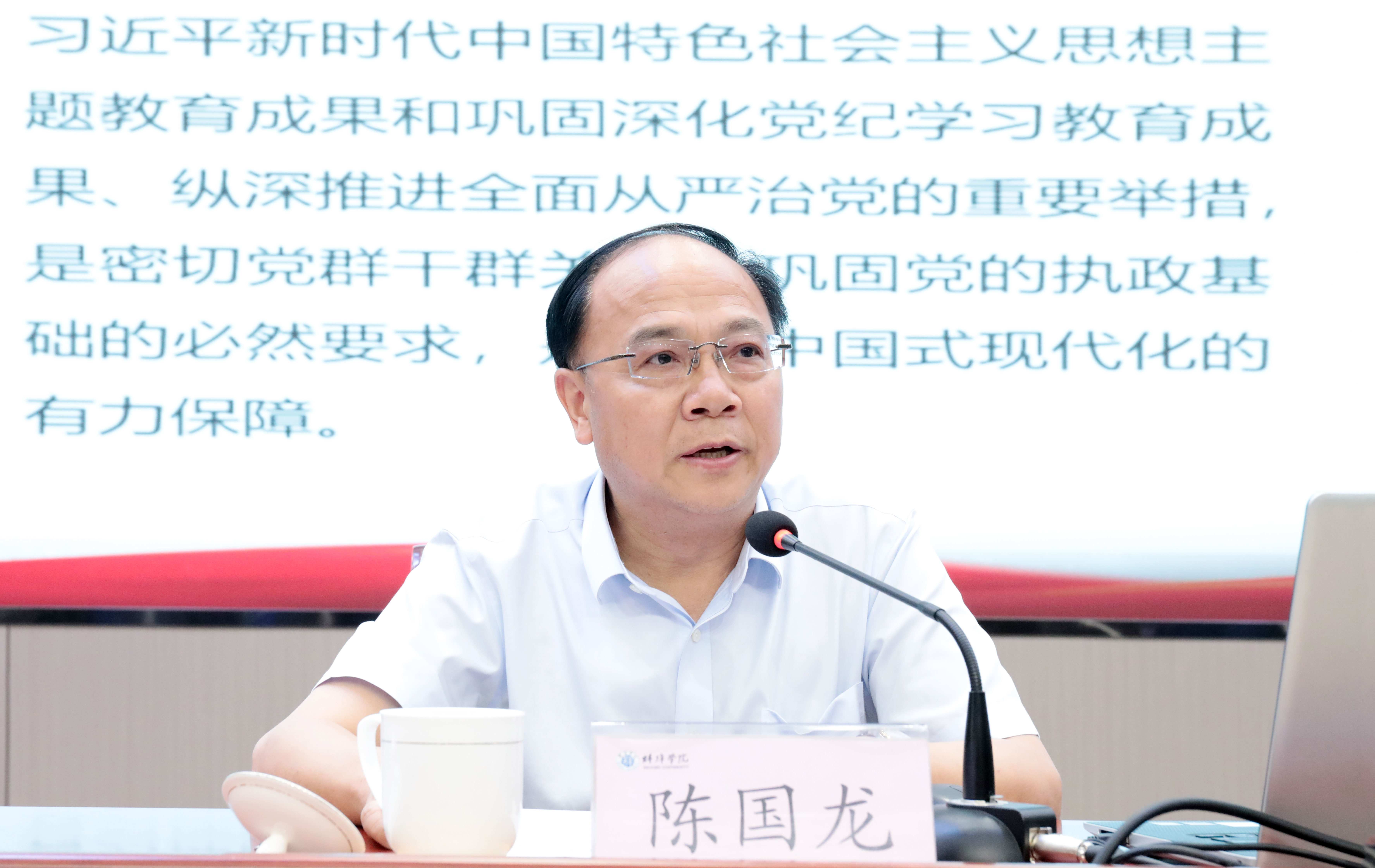 会上,校党委书记陈国龙讲授“七一”专题党课。党课围绕“深刻领会习近平总书记关于加强党的作风建设的重要论述、深刻认识中央八项规定取得的历史性成就”,阐述开展学习教育的时代背景和重大意义。同时,结合学校实际强调要持续强化理论武装,在学有质量上下真功见实效。抓实研讨交流“深入学”,强化警示教育“震慑学”,聚焦关键群体“示范学”,学深悟透,推动学习教育走深走实。要持续查摆问题不足,在查有力度上下真功见实效全面查摆自身找问题深入调查研究找问题结合反馈意见找问题,让问题查摆更精准、集中整治更有效。要持续开展问题整治,在改有成效上下真功见实效。明确责任、扭住重点、建章立制,一改到底。要持续扛牢责任担当,在推动发展上下真功见实效以更实作风抓好巡视整改迎接审核评估推进创硕攻坚,紧紧把握住学校快速发展的难得契机,为实现学校高质量发展书写新的辉煌篇章。