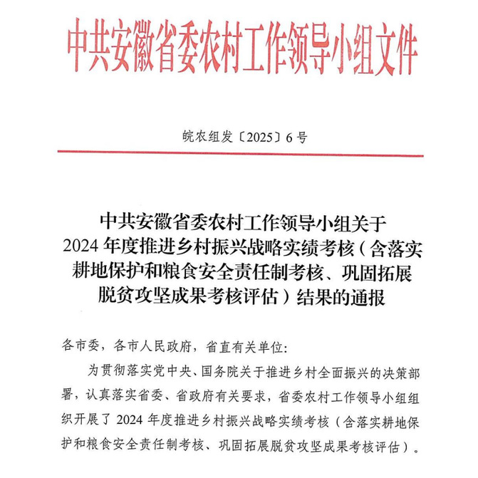 近日,中共安徽省委农村工作领导小组印发《关于2024年度推进乡村振兴战略实绩考核(含落实耕地保护和粮食安全责任制考核、巩固拓展脱贫攻坚成果考核评估)结果的通报》,beat365平台官方网站在2024年度省直有关单位定点帮扶工作成效考核中荣获“优秀”等次,充分彰显了学校在助力乡村振兴工作中的扎实成效。