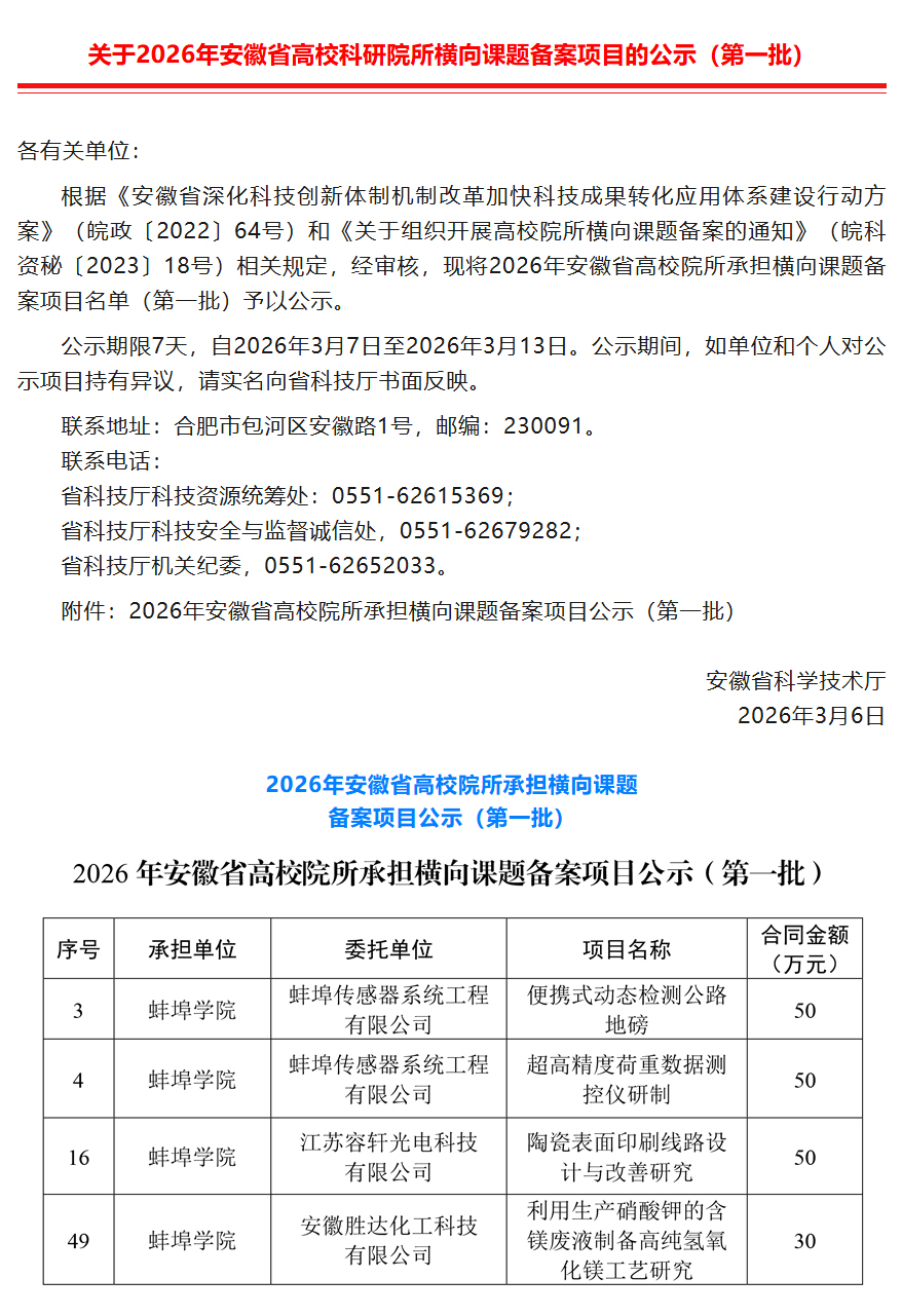 日前,省科技厅发布2026年第一批安徽省高校科研院所横向课题备案项目立项计划,beat365官网“便携式动态检测公路地磅”等四个项目成功入选,按照政策可视同为省重点研究与开发计划项目,这是beat365官网首次入选该计划,标志着beat365官网产学研合作及科技成果转化工作取得重要突破。据悉,此次入选的四个项目紧密围绕软硬件传感器平台搭建、陶瓷表面印刷线路设计和含镁废液有效利用等产业实际需求开展研究,是beat365官网深化校地企协同创新的重要成果。项目主...