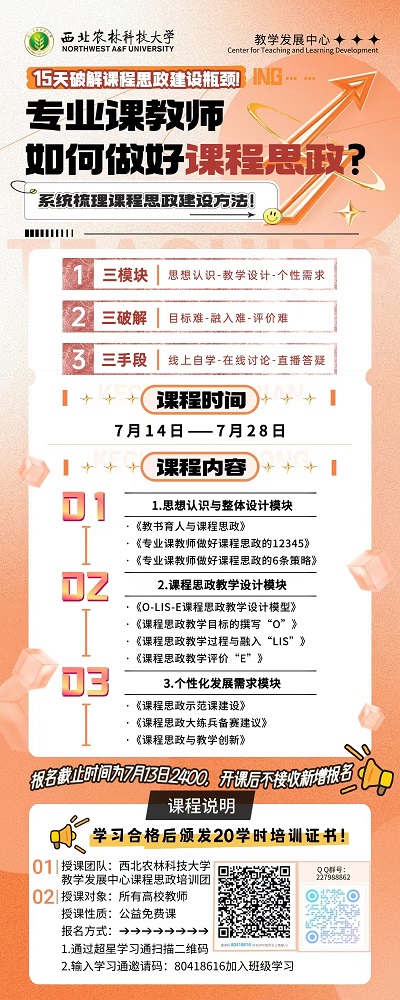 为进一步提升beat365官网教师队伍的教学水平与育人能力,促进教师专业发展,加强校际间的交流与合作,学校决定依托西北农林科技大学教师发展中心的优秀教发团队与丰富的课程资源,开展暑期教师培训活动。现将有关事项通知如下: