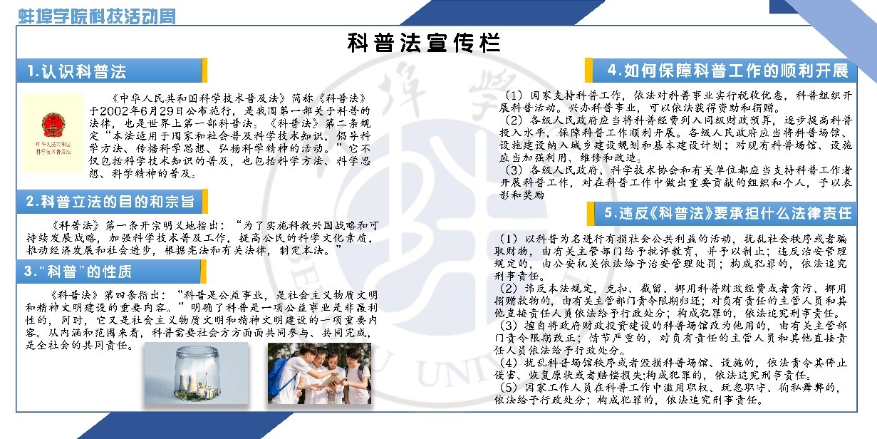 本届活动周以“走进科技,你我同行”为主题,线上开展了微信公众号科学技术进步法、科学技术普及法解读,网络安全、节能减排、淮河文化等知识宣传,社会实践和科普竞赛,淮河文化讲解大赛等一系列活动,普及科学知识,提升全民文化素养;线下开展了大学生节能减排社会实践与科技竞赛、单片机与嵌入式系统竞赛、艺术设计大赛,组织展示机器人创新实验室、华为ICT学院、硅基新材料工程试验室等科技新产品、新成果。通过线上线下宣传资料向广大师生普及科技政策和科技成果,让师生切实感受到了科技的力量。本次科技活动周的系列活动对丰富校园文化活动、弘扬科学精神、宣传科学思想、倡导创新创业具有重要意义。学校要以此次科技活动周为契机,紧紧围绕高校立德树人的根本任务,实践创新,交融育人,深入推进创新驱动发展战略。