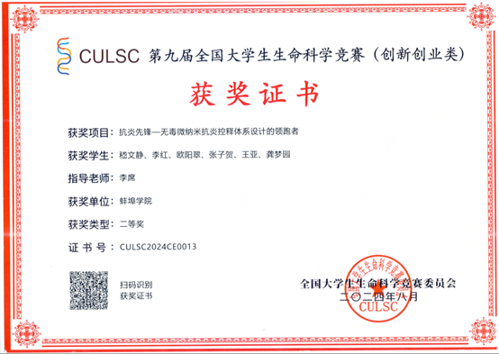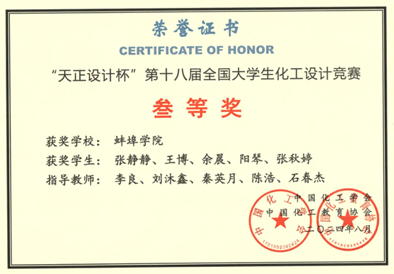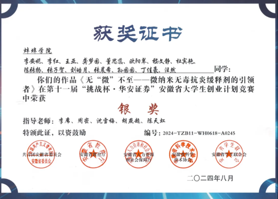 以学科竞赛为抓手,学生参与科研活动,培养实践创新能力。学生获批大创项目国家级立项22项;获安徽省第十六届大学生职业规划设计大赛铜奖1项。学科竞赛成绩突出,第十一届“挑战杯”安徽省大学生创业计划竞赛省级银奖1项、铜奖4项;安徽省大学生创新大赛(2024)获铜奖4项;2024年“汇泰•欧倍尔杯”第十八届全国大学生化工设计竞赛全国二等奖1项、三等奖2项,华中赛区一等奖1项、二等奖1项、三等奖2项;第九届全国大学生生命科学竞赛(创新创业类) 创新组全国二等奖,第七届安徽省大学生生命科学竞赛(科学探究类)省级二等奖;第七届全国大学生化工实验大赛华东区赛仿真单项奖2项;安徽省大学生节能减排竞赛项目三等奖1项。学生参与申请专利8人次、发表论文23人次,科研育人成效显著。