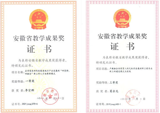 教研成果:学院获批国家级一流本科课程1门,省级一流本科课程6门,获得安徽省省级教学成果一等奖1项、二等奖1项、三等奖1项,第二届全国高校教师教学创新大赛(安徽赛区)选拔赛二等奖1项、三等奖1项,主编出版教材16部,共有30多个校外实践教学基地和产学研基地。学院教师积极开展科学研究,积极融入地方产业,在硅基新材料、生物基材料、生物医药等研究方向上成果显著。