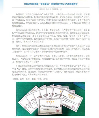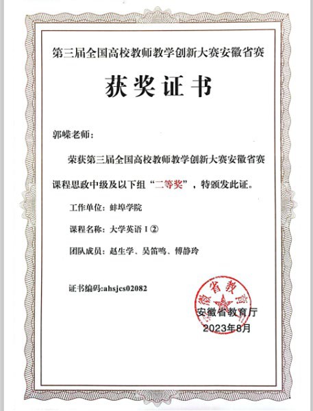 学院将思想价值引领贯穿教学、教研、科研全过程,探索协同机制。试点建设以来,教师在各类教学竞赛中成绩斐然,如 2 人获外研社“教学之星”大赛全国复赛一等奖,1 人获首届全国高等学校外语课程思政教学比赛全国决赛二等奖等。学院还获批大学英语课程思政省级示范中心 1 个,课程思政类教材建设项目 2 项,形成 4 门富含课程思政元素的通识类课程。