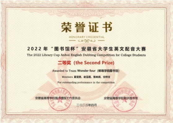 学院加强英文话剧社校园文化品牌建设,开展英文话剧小剧场、英文配音秀等活动,形成传统文化、红色文化、Disney 系列小剧场作品。在安徽省高校图书馆杯红色电影配音大赛中,三年获季军团队奖 2 项、作品二等奖 1 项、优秀组织奖指导奖 3 项。
