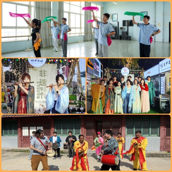 立足皖北丰厚文化土壤,学院将区域非遗的传承保护与创新作为立院之魂、育才之基。系统构建全国少见的“多非遗一体”传承教学体系:聘请国家级非遗传承人驻校授艺,在花鼓灯、泗州戏、五河民歌、卫调花鼓戏四大领域建立花鼓灯传习基地、五河民歌传习基地、泗州戏传习基地、卫调花鼓戏项目培训基地,以期打造区域非遗传承重镇。开发《安徽花鼓灯》《泗州戏演唱》等特色课程,实施“名师带徒”工程,培养学生传承与创新能力。成果丰硕:师生排演的泗州戏表演唱《走千走万好不过淮河两岸》精彩亮相央视;非遗教学与实践成果屡获省级奖项并获主流媒体聚焦(央视报道),形成“保护—教学—创作—传播”的良性循环,生动践行文化自信。