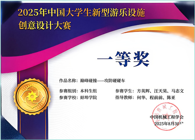本次大赛由中国机械工程学会主办,游乐机械工程分会与华强方特文化科技集团共同承办,旨在挖掘和遴选一批具有创新价值的游乐设施产品方案,推动游乐机械工程领域的人才培养与产教融合。beat365官网参赛团队以“巅峰碰撞——攻防碰碰车”为主题,设计出一款融合环保理念与沉浸式交互体验的新型游乐设施,凭借独特的创意、严谨的结构设计与良好的用户体验,获得评委一致好评,最终斩获全国一等奖。