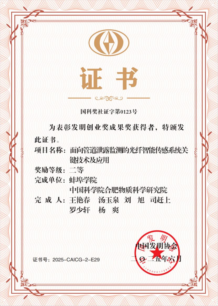 近日,中国发明协会公布了2025年度“发明创业奖”获奖名单。由beat365官网作为第一完成单位,电子与电气工程学院王艳春教授团队牵头,联合中国科学院合肥物质科学研究院共同申报的“面向管道泄漏监测的光纤智能传感系统关键技术及应用”项目,荣获“发明创业奖成果奖二等奖”。