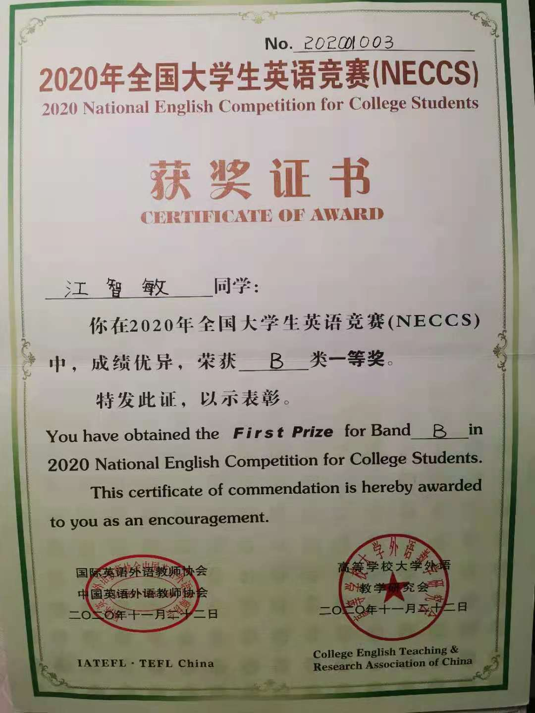 陈诺,19英语(升本)专业学习委员,获得校二等奖学金,目前已被  南京师范大学录取。