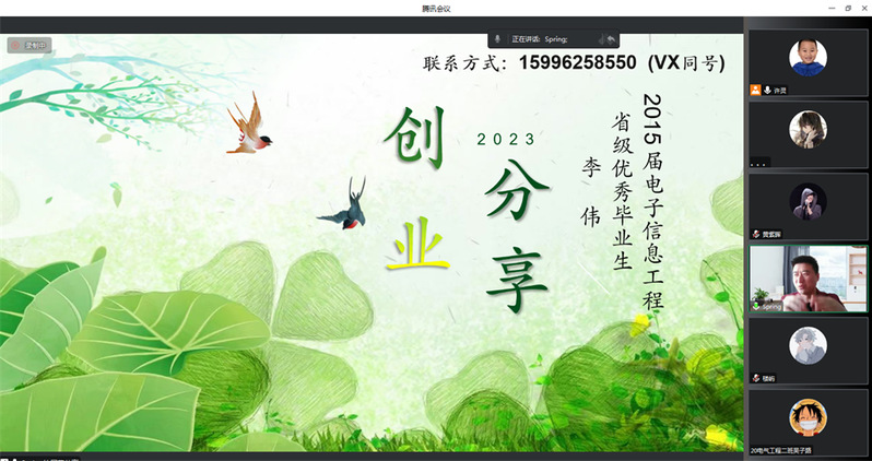 4月21日,电子与电气工程学院特邀2015届优秀校友李伟为同学们上了一堂精彩的思政课。李伟以自身发展经历为主线,分享了在人生路口面临抉择时自己毅然选择艰难创业的心路历程,建议同学们在校期间要树立合理目标,努力学习掌握专业知识,重视课外实践和身体锻炼。在未来工作中坚持学习,善于发现并把握机遇,并深切表达了对母校多年栽培的感谢和对母校未来发展的深深祝福。