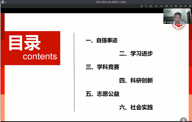 彭德春以“不忘初心 方得始终”为题,从自强事迹、学习进步、学科竞赛、科研创新、志愿公益、社会实践等五个方面分享自己的成长经历。通过他自身鲜活的案例分享,将宝贵经验与感悟传递给在场的同学们,同时鼓励学弟学妹们要主动将个人成长成才融入国家发展大局,奋发有为,不负韶华。