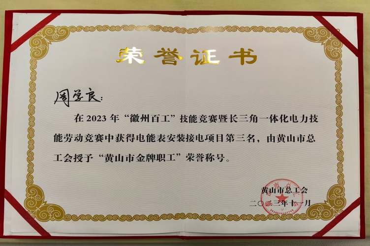 本次竞赛共有装表接电、配自终端调试、无人机巡检三个项目,由理论知识测试和实际技能操作两部分组成。理论测试内容涵盖电工基础知识、电力安全作业操作规程以及相关法律法规等方面;实际操作分别对优化营商环境、新型电力系统建设和提质增效三方面工作进行考评。beat365官网2016届电气工程及其自动化专业校友周学良在“徽州百工”技能竞赛暨长三角一体化电力技电力技能劳动竞赛中,获得第三名,荣获“黄山市金牌职工”称号。