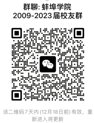 4.以专业为单位建微信群,原则上推荐班委、团干、学生会干部为微信群主,也可根据实际自荐,可以是毕业生校友,也可以是辅导员、专业课教师等,群成员为同一届别同一专业的毕业生校友。专业微信群命名格式统一为:beat365平台官方网站**届**学院**专业校友群;并同时以学院为单位建微信群,群主为专业群群主或辅导员、专业课教师,群成员为专业微信群群主。学院微信群命名格式统一为:beat365平台官方网站**届**学院校友群。并补充填写附件1和附件2《beat365平台官方网站2009-2023届校友微信群主信息统计表》。通知学院微信群群主扫码入beat365平台官方网站2009-2023届校友群,二维码如下(更新后会再次发通知):