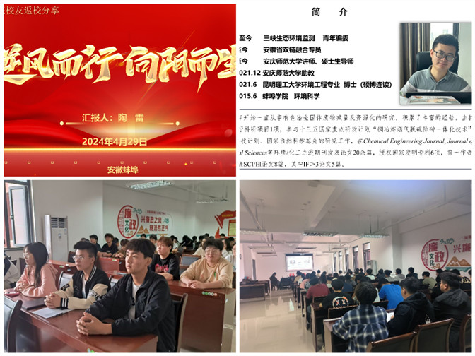 不断提升铸魂育人实效,为凝聚朋辈引领合力,增强学风建设,深化职规意识,深化思政课程改革创新,土木与水利工程学院于4月29日中午,邀请了三峡生态环境监测青年编委、安徽省双链融合专员、安庆师范大学讲师、硕士生导师陶雷校友,以线上和线下相结合的方式,开展“逆风而行,向阳而生” 主题交流分享,覆盖全院一千多名学生。