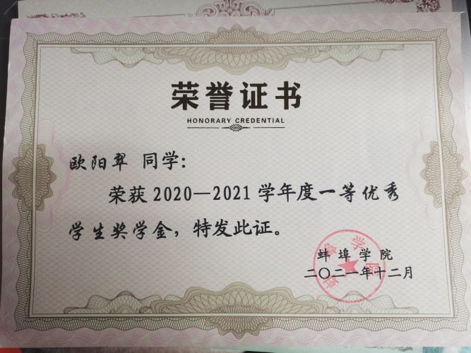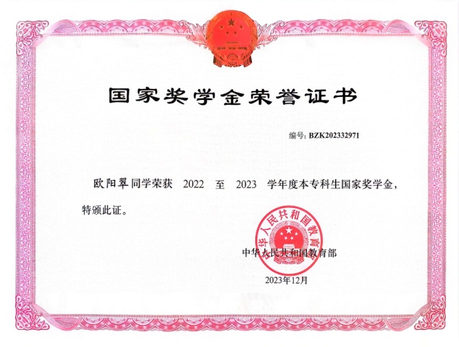 欧阳翠,2020级应用化学2班学习委员,国家奖学金获得者,多次参加挑战杯并获省级奖项,目前已考取南京工业大学。