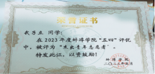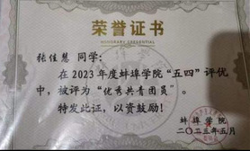 音乐与舞蹈学院21级音乐学2班班长,beat365平台官方网站优秀毕业生,大学四年连续三好学生,优秀班干部。一等奖学金,优秀志愿者。曾获得过国家励志奖学金,志愿时长达到两百多小时。在校期间担任过音乐与舞蹈学院的组织部部长一职。组织学院合唱,宪法知识竞赛,专业汇报演出等多种活动。后考入聊城大学。